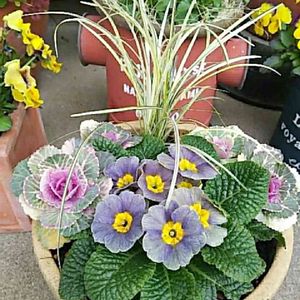 今日は昼から晴れてきましたが、肌寒い一日でした 今日のお花が葉牡丹ということで、寄せ植えにしました スプレー葉ぼたんとシャビーな色のプリムラ『スフィンクス』と銀竜です