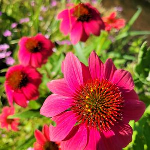 おはようございます·͜· ❤︎🌱✨ 7月1日(火)☁☀32℃予報 朝はムシムシ曇ったり陽射しが差したり〜庭 畑 パトロール 汗だく( ˊᵕˋ ;)💦 🏷真っ赤な火曜日 真っ赤なお花ギラギラ元気な花 ❤️✨❤️✨❤️✨❤️✨❤️ ①エキナセア ②インパチェンスモリモリに 毎日暑さで夕方には〜 水切れ朝水💧たっぷりw ③木立ベコニア大きくなってきたぁぁ今日は花をアップでꉂ🤭 ④真っ赤なセンチニチコウ🔴🍃朝切り花に✂️⸒⸒ ⑤最近植え付けお花達 🍅10円だった苗🌱プランターで真っ赤な実がꉂ🤭 7月スタート🎋 今月もよろしくお願いします 熱中症対策気をつけて 元気でお過ごしください😄