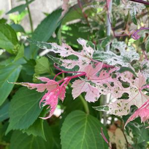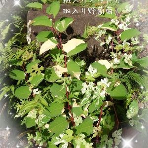 すでに暑くなってきました☀ 少しでも涼しげな 斑入り葉を😅 ①斑入りイタドリ と 斑入り野葡萄 ②斑入り野葡萄がのび過ぎで いろいろ絡まり始めて〰️😱 ③ニューサイランの葉に 野葡萄のツルが絡まってる〰️💦