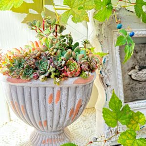 今朝も寒い🥶 朝からビオラレディの植え替えしたよ そして今日はハイポニカの日 風が強いとお花が乾くね〜 一週間に一度ハイポニカ 夏終わりごろから初めたんだけど… カブがすごく元気になってるのが日に日にわかる 10月に寄せ直した 多肉の寄せ植え なんとかやっと爪💅が出てきて 少し可愛くなってきました 春が楽しみ😊 野葡萄の実 ブルー🩵グレー🩶紫🟣 このカラーが見たくてね😉 斑入りなんだけど 夏頃からミドリン子になってきたよ 春先の葉っぱ🌿はすっごく素敵なんだけどな〜 落葉するから少しカットして飾ってみたよ 尊敬しているタニラーさんからいただいたリメ缶に 夏頃いただいた姫秀麗 いただいた時からピンク🩷だったのを…夏終わりにポロポロ取れるピンキーを挿してみたんだ 最近いいお色になって可愛くなってきました ピンキーは夏と冬のギャップが凄すぎる多肉ちゃんですね ◌︎⑅⃝︎●︎♡︎⋆︎♡⃝︎ ˻˳˯ₑ♡⃝︎⋆︎●︎♡︎⑅⃝︎◌︎