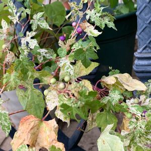 🍀斑入りノブドウ🍀 雨風強いのに頑張って写してきたよ。😅💦 ピントが合わなくてボケボケだけどお許しを〜🙇🙇 去年置き場所だと、勝手に切られてしまうので フェンス側に鉢を移動させました。 🏷2のつく日は斑入り日 🏷つぶつぶの日 🏷ちっちゃいものクラブ に参加させて下さいね。