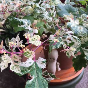 昨年お迎えした斑入り野葡萄さん 昨年、途中から斑が消えて緑の葉っぱになってしまった野葡萄さん 斑入り復活‼️瑠璃色の実沢山ついて欲しいなぁ… 一度「ズッキュ〜ン」💘💘💘と言ってみたいと恥ずかしがりやのエンジェルが野葡萄の葉の下でもじもじしています よろしくお願いします(u_u)♡