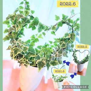 おはようございます🥰 一年かけてアイビーのハート仕立てが完成〜💚✨我ながら上手く誘引出来ました💮🌿🍃 ワイヤーは100円ショップの支柱を曲げたものです💕