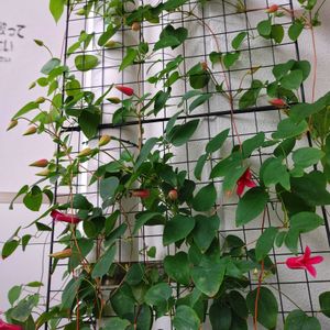 引きで😆去年挿し木した保険株たちを一か所に集めて倉庫の側面に100均のワイヤーネットと磁石のついたフックでなんちゃってラティスに誘引してます😊 合計1200〜1300円ぐらいで出来ました🤣 クレマチス ジェニー ビクトリア マダムジュリアンコレボン 踊場