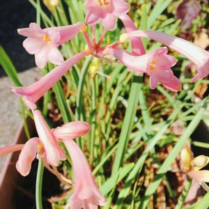 キルタンサス マッケニー 冬のお花が少ない時期に毎年可愛い色合いのお花が咲きます😊💕花友さんちから3年ほど前にやって来ました。鉢増ししながら今も鉢住まいです😄長い時期咲いています❣️ 調べてみると、 原産地南アフリカ ヒガンバナ科の半耐寒性球根 地植えの場合は、霜が当たらない日当たりのよい場所に植えます。植える深さは、鉢植えと同じように球根の2/3が埋まる程度で、10~15cm間隔で植えます。また、泥はねと冬の地面の凍結防止に、株元にマルチングを施します。 鉢植えの場合、最初は直径15cmの鉢に5球程度とします。植える深さは、球根の2/3くらいが土中に埋まるように植えます。用土は腐葉土が3割くらい入った培養土を使います。 キルタンサスは水を好む植物なので、植えつけ後は、たっぷり水を与えます。特に「マッケニー」は水を好み、土が乾くことを嫌うので気をつけましょう。 キルタンサスの生育サイクルは他の球根植物と異なる点があり、生育状況に応じた管理が必要となります。 開花する時期の管理は、日ざしと水を必要とします。よく日の当たる場所に置き、鉢土は乾かさないように、たっぷりと水を与えます。 次にキルタンサスは、梅雨明け後から9月中旬頃までが、休眠期となります。25℃以上の高温と強い日ざしを嫌う植物なので、鉢植えの場合、風通しがよく涼しい、午前中は木漏れ日が当たる場所に置きます。また、強い西日には当てないようにします。涼しく保ち、水を十分に与えると、夏でもゆっくりと葉は増えます。 夜の気温がマイナス以下になる時期は、南向きで北風が避けられ、日だまりとなる軒下などに置きます。マイナス1~2℃くらいまでなら、軒下でも花は咲き続けますが、マイナス5~6℃以下になると花梗が折れたりして花が傷みます。このような時は夕方、玄関内などに取り込み、凍らないように保護します。厳寒期に凍らないようにすると、5月頃まで次々と花を咲かせます。