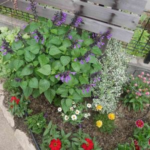 庭のサルビア、 スーパーサルビアロックンロール、カラーはディープパープルです。 植木鉢を半分だけ庭に埋めてたら 一段とボリュームアップしました❣️👍️ 2枚目写真は植え付け直後、 どの花も元気です。 センニチコウの花でドライフラワー作ろうかな~😀