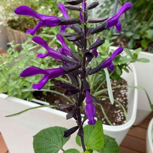今日も暑くなりそう☀️ 鉢植えのスーパーサルビアロックンロールのディープパープル💜が冬越しして元気に咲いてくれています😆 あまりにも大きくなり過ぎて、半分くらい剪定しました✂️