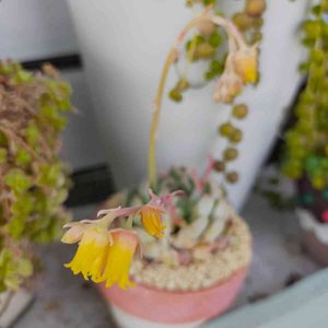 多肉棚のエケベリアのお花が咲いています✨ 長~く伸ばした枝先にベル型の可愛いお花がぶらさがって咲く姿が可愛いです💞