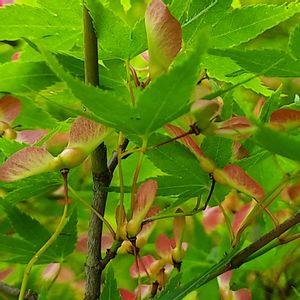 イロハモミジ(いろは紅葉) 映えてます 実家の庭のモミジです🍁 今の季節は新緑が美しく、秋とはまた違った風情で楽しませてくれます 花が終わり、赤いプロペラ(紅葉の実(種))がたくさん♪
