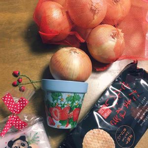 わらしべ長者になっただよー┌︎|≧︎∇︎≦︎|┘︎ いちごちゃんからの素敵便❤️ 玉ねぎめっちゃ大玉✨✨✨ さっそくジャーマンポテトに使ったよ💕 甘くって美味しかった〜💕💕 いちごのリメ鉢とピックもめっちゃ可愛いの😍 本当ありがとうございました〜 大切に使わせて頂きます❤️