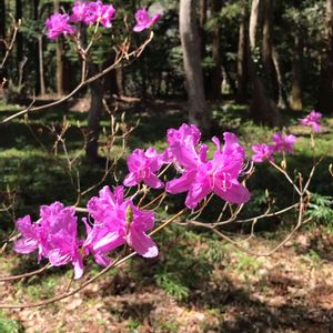 ミツバツツジです。 この公園では広葉樹(落葉、常緑樹混在)林内に点在しています。 陽当たりの良いところでは花の色が薄く、常緑樹の陰になるところでは花付きが悪いようです。やはりほどほどの陽当たりを好む感じですね😊。この写真の被写体はもちろんほどほどです♪😊。 名前のミツバですが、今は花のみで葉っぱは出ていませんので、名前の由来は確認できません😅。