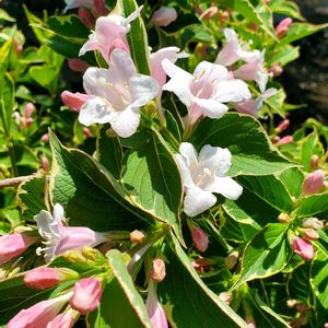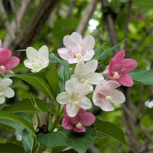 🩷オオベニウツギ(大紅空木) 咲きはじめは白色で咲き進むにつれてピンクに変化していきます。空木に見た目が似ているだけで枝の中が空洞ではありません。 ⚫︎スイカズラ科 タニウツギ属 ⚫︎原産 中国 ⚫︎花期 5月〜6月