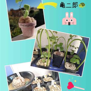 実生記録 アフリカ亀甲竜 ↖️chisa♡ちゃん手作りの亀二郎🐢 ⬅️元気よく葉を繁らせている🐢 ↙️まだ寝てる🐢 今年の実生っコベビー🐢は一度寝たので、また起きてくれると信じてます😁 🐢💚