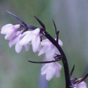 黒龍🐲ブラックドラゴン クールな名前ですが 小さくてかわいい花が咲きました🌸 黒羽色の葉っぱの中に ポツンと淡い薄桜色の花が咲く様子は、何とも言えません😊