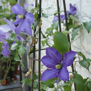 クレマチス ラプソディー💙💜💙 横向きの青い花をつけるクレマチスです。 群青色の花びらに クリーム色の花芯との コントラストが美しいですよ 遅咲きで6月頃からの花期 って書いてあったけど もう咲いてきました୨୧⑅*. 🔖水曜水色