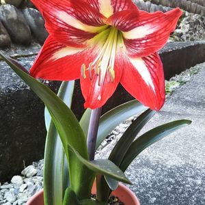 アマリリス 私の小学校の頃の音楽の教科書にアマリリスという曲が載っていました🎶 訳も分からず歌っていたのですが花の名前だと分かりどんな花なんだろうとずっと思っていました🤔 まだ花を愛でる余裕の無い時代だったのか、寒冷地には無い花だったのか、曲自体が外国のものだった気がします。 数年前に知人から沢山の球根を頂いたのですが冬の間に全部凍らせてしまいました☃❄💦 寒冷地での冬越しは室内だと解り昨年から蘭の鉢と同じように室内で保管していたものがついに咲きました‼️ 小学校からのモヤモヤ(´・_・`).。oஇが今朝数十年ぶりに解消されたのでした〜 ♪̊̈♪̆̈🎶ラリラリラリラー、しらべはアマリリス〜🎶 って歌でした🎶