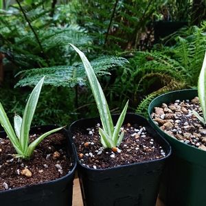 ■フルクラエア フォエティダ メディオピクタ ・キジカクシ科フルクラエア属/熱帯アメリカ原産 3月沖縄遠征時に、きのこ🍄さんより頂いたチビ子株がやっと根づいてくれたので植え替え完了です。大阪で冬を越すのは難しそうなので1シーズン限定かもですが、今から畑行き🚗 最高気温28℃、最低気温24℃ 以下、みんなの趣味の園芸より (特徴) フルクラエア属(Furcraea)は、熱帯アメリカに21種が分布しています。 観葉植物としてよく栽培されているのは、フルクラエア・フォエティダ(F. foetida)の斑入り品種の‘メディオピクタ’(F. foetida ‘Mediopicta’)で、緑色地の葉に淡緑色や黄白色の中斑が大きく入ります。葉は大きくなると、自生地などでは2.5mにもなりますが、鉢植えでは30~100cm程度です。なお、フォエティダはマンネンランと呼ばれ、大型になります。フォエティダや斑入り品種はアガベ属(リュウゼツラン属 Agave)に姿が似ていますが、葉縁にとげがなく、わずかにギザギザがある程度なので見分けられます。10年以上育てていると、株の中心部から長い花茎を伸ばし、多数の花を咲かせます。花茎の高さは、鉢植えでも3m以上になるほどです。花後に株は枯れますが、そこに無数の子株をつけます。
