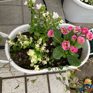 2018想い出の寄せ植え(*˘︶˘*).。.:*♡ プリムラジュリアン幸せリング 開ききらないカップ咲き 控えめなタイプの個体を選んで( ¨̮ ) 根鉢を崩さなければ大丈夫かな? 難しいプリムラジュリアン!