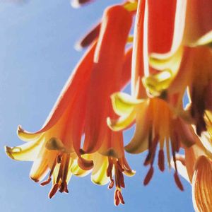オレンジ色の花が路地に並んで咲いていました。とても不思議な形で初めて見たような。 葉を見てサボテンの仲間かと思ったのですが、調べたらアロエでした。