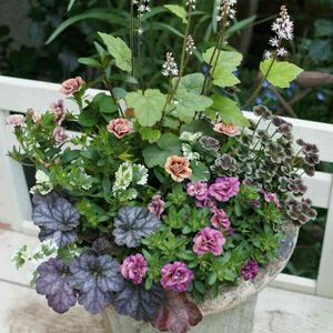 カリブラコア ティフォシー アンティークシリーズ(No.75,76)を使った寄せ植え 暴れ成分(?)に、庭で雑草化しているグレコマとチョコレートミントを足してみました🍫 しばらく黄色と紫に囲まれすぎた反動で、今は渋めの暖色系がマイブームです(*´罒`*)♡