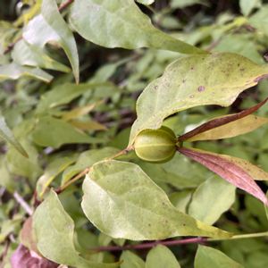 ツクバネ 茶褐色に色づいてツクバネの実が熟した(^^) 熟した実は、4枚の長い苞をくるくると回しながら風に乗り落ちていく✨ しっかりと光合成しているように見えるけれど半寄生植物で、根は宿主の根を包み込んで栄養分を取り込んで生きている雌雄異株f(^^;