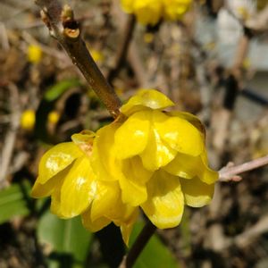 1/25㈬① 🏷百花魁 素心蝋梅の花が咲いていました😊💛 蝋細工のような艷やかな花びらは透明感があって綺麗です。 梅という字は付きますが蠟梅は蠟梅科蠟梅属で、梅はバラ科サクラ属、全くの別種です。黒い実も食べられません🤭 いつもの散歩道から入る路地に咲いてるのを去年知りました😄💛💛 昨日、今朝は冷え込みましたね〜! うちの方は雪は降りませんでした。 寒かったので久々のキムチ鍋🍲美味しかったです。温まりました♡♡♡ 日曜日は息子の退職挨拶のお菓子を買いに行くのに付き合って町田に行き、小田急のデパ地下でアレコレ買って、LUMINEでランチ食べてきました。 焼き立てのピザは生地がパリパリして熱くて美味しかったです😊💕少量パスタ、サラダ、ブイヤーベースも美味しくてお腹いっぱいになりました😋息子の奢り!ご馳走様でした😄🎶🎶