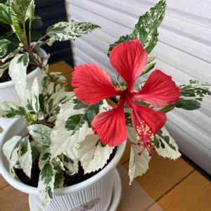 めっちゃかわいい🌺🌺🌺 今朝咲きました。斑入りの葉っぱに赤い花 お花の前に、何度立つことか🧍♂️ aliceちゃんありがとーー😊