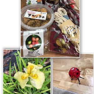 aliceちゃんからの、素敵便‼️ 出てくる!出てくる、次々と😍 嬉しすぎて、笑っちゃう💕 ご当地お土産 亀の最中、きなこまめ、コーヒーの種 紙ふうせん(てんとう虫🐞にパンダ🐼) そして、ao☆ちゃんのプラハン❤️ 紙ふうせん、孫が喜んで遊んでいます。 aliceちゃん ありがとう😊 黄色の花しょうぶが咲きました!