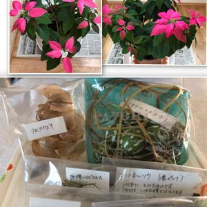 aliceちゃんから、ヤッタネー便😆 お花の種がたくさん届きました! クロホウズキ オキナワスズメウリ フランネルソウ アサガオ 原種ハイビスカス つるなしアサガオ ハイビスカスの種初めて見ました! ビックリです‼️ 来年が楽しみ! aliceちゃん ありがとうございます😊 プリンセチア、だいぶ葉っぱ落ちましたがまだ、元気です! 右は、10月の終わり、1番きれいな時 左は、今現在です!