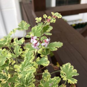 こんにちは😊☁️ 斑入りナツメグゼラニウムの小さな可愛いお花が咲いてます🤍💚🩷 ちょっとスパイシーな葉の香りに癒されます🍀*゜