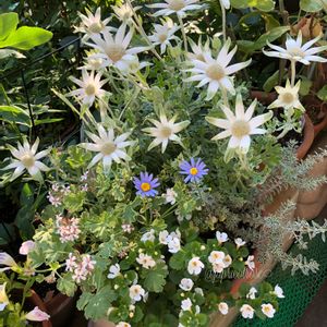 フランネルフラワーの寄せ植えです♪ 白い花を集めてブルーをちょっぴりアクセントにしてあります。 フランネルフラワーは去年寄せ植えにしてあったものをバラして冬の間室内で管理しました。春になったらどんどん花を咲かせてくれています✨