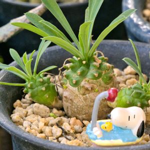 ユーフォルビア達と彼岸花で、 🏷毎月2日はスヌーピーの日 に参加しまーす🪨 (・´`(●) 1⃣ユーフォルビア峨眉山 2⃣ユーフォルビアアンボボンベンシス 3⃣ユーフォルビアキリンドリフォリア 4⃣彼岸花 5⃣ミセバヤに水滴💧 所々写ってるプラティクラダがホント、ゾンビみたい😂