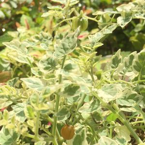斑入り葉のトマト🍅 実は1cmほどのマイクロトマトサイズ💕 可愛いけど美味しくないです😅 肝心な食べられるトマトは……まだ青い… 花がポロポロ落ちて実付きが悪いです😢