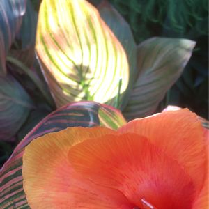 カンナ ベンガルタイガーにお花が咲きましたฅ( •ω• ฅ)ガオ-♡ 予想に反してオレンジ色でした🧡 葉っぱの一部に陽が当たって 幻想的な雰囲気に✨ 訂正 : カンナ ベンガルタイガーではなく、ダーバンのようですm(_ _)m