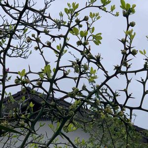 ウチの カラタチ です😊 花が咲き始めましたよ 見ての通り‼️トゲトゲです😅💦 見るからに痛そう😰