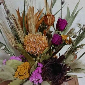 おはようございます✨ ドライフラワーのアレンジがほしいとのご注文を頂きプロテアを入れたかったのと動きを出したくてこんな感じに( * ・ᴗ・ )* まだ渡せていませんが写真を送ったらとっても喜んで頂けました👏💞 先生をしていて教室の入口に飾って頂けるそうです😆 千葉県は雪にはなっていませんがとっても寒い❗ ずっと足の冷えとかかとガサガサに悩まされていたけどとても素敵な靴下に出会い解消されつつあります♥️