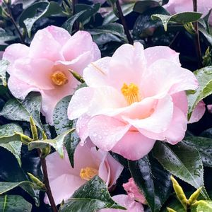 🏷️木曜日は桃色 🏷️木曜日は木に咲く花 🏷️ピンクワ-ルドへようこそ 🏷️モダンな木曜日 🏷️雨粒シリーズ⭐ ツバキ(椿)💟 今日も1日冷たい雨降り☂️ 毎日通るご近所さんの椿 今朝は時間があったので、車🚙とめて パチリ✨🤳 大きな花が雨に濡れキラキラ✨ 素敵でした✨✨✨🩷