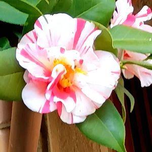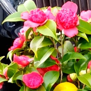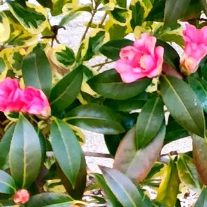 中心が濃いピンクで葉っぱの大きい低木のツバキ✨ 名前はわからないけれど可愛い🩷