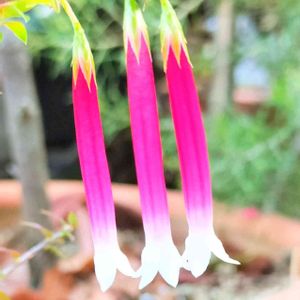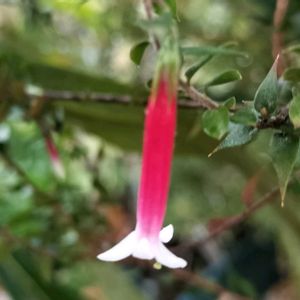 夢の島熱帯植物園にて。 オーストラリア南東部原産。 エパクリス科エパクリス属。 別名Fuchsia Heath(フューシア・ヒース、フクシア・ヒース) Native fuchsia(ネイティブ・ヒューシア) 葉は小さな三角形で、先端には鋭い棘が! 花の先端は白く星形に♪