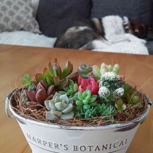 友達へのプレゼント用に多肉を寄せ植えしてみました😁 サボ🌵にメガネもかけてみました👓️ バックで愛犬さんお昼寝中🐶 アルグルにキュンした瞬間です😌