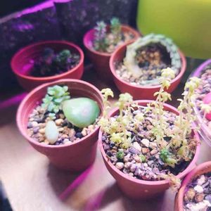 😃🌃今晩は 植え替えの記録として セダム属同士にしてみました☺️ どちらも上手く成長できていませんでした(/´△`\) クラバツムはかなり徒長していて、☆にはならずにまぬかれていましたが、今後どうなるか?