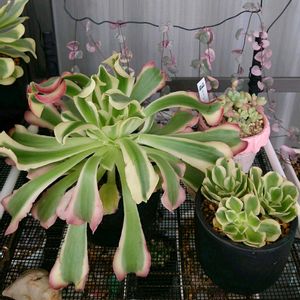 おはようございます ☁️ 🪴 アエオニウム 右 マイバッハ 子株3個、1年中緑のままらしいですね🧐 左 リバーストーン 後ろの子株が大きくて形が いびつです🥹 pic2 名前がそれぞれ違うんですけど 調べて見ると品種としては同じ?👀 アエオニウムは場所取るんですけど どんどん増えてます マイブーム😄