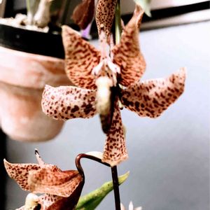 Cyc. TIDC Purple Frilled Lizard 'Orange Coffee' 2輪目も開き満開🌸🌸 シクノチェスのお話し🌸🌸🌸 シクノチェスは基本的に一子一代🧐 新芽🌱が成長するに従ってバックバルブ(おばあちゃん株)は一生を終えます🙏 即ち親株と子株だけになり元気なバルブが3本並ぶのは非常に少ないんです😔 なので親株、子株が調子を落とすと枯れやすくカタセタム属のなかでも栽培は難しいと思います😣 特に原種はこの傾向が強く難しいです😔 カタセタム属なので育て方は基本的に同じなのですが寒さに弱く栽培温度もやや高めであまり植え替えし過ぎると枯れやすいです😭 お日様が大好きで❤️成長期はバンバン水遣りします💧💧💧 冬場は他のカタセタムより水分少なめ乾燥気味に育てますが湿度は高めにします🧐 へそ曲がりで拗らせれると回復は難しいのでいつも一番いい場所に置いています😊 忘れられるのが嫌な様です😥 🌸🌸🌸 そんなシクノチェスは「スワンオーキッド」と呼ばれています🤗