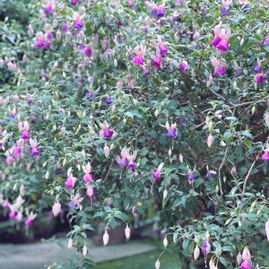 富士花鳥園 巨大フクシア! 吊り鉢ですだれのように仕立てられたフクシアもたくさんあってそちらも圧巻なのですが、こちらは木立してオバケのようになっているフクシアです😳! ホームセンターでよく見るものと違って花自体も大きいんですよね〜