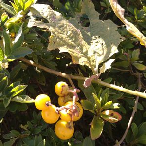 精神年齢が小3男子のオバ2人で久しぶりにピクニックランチ🍙 食後にそぞろ歩いていたら まっ黄っ黄の実を見つけました。 ナニナニ?と訊いたら ワルナスビだそう。 トゲトゲで繁殖力旺盛で厄介者の外来種ですが、 お花も実も可愛いんだよね〜 名前がお気の毒だけど💦