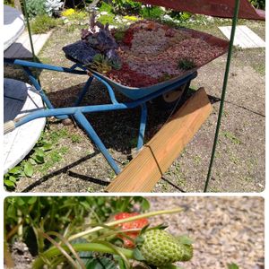 でーきーたー!次は何や!て? いちごですいちご 庭に棺のように並んでる仕切りの中に いちごの苗を植えたんですよ。 すくすく育ってくれて 昨日は5個も! これは毒味せなあかん。 そのまえに せっかくやでセダムの山に乗せてみた。 綺麗な赤ですね。 でも裏側はまだ早い感じですが。。 娘にね、腹痛起こされたらアカンで しっかり毒味しましたよ。 美味しすぎる。甘いです! これからは鳥との戦い。 どっちが先に収穫祭するか!です。 で、 昨日また違う場所に遮光シートを はりました。 ここで寄せ植えとか 植え替え作業するんですけどね。。 多少は日焼け予防になるかな?(人間の) でも暑いのは変わりなく 昨日も昼前から16時頃まで ハウスからは離れていました。 Google Mapの時間は16時~19時に 変更をしました。 お時間の合う方居るかな😂 曇りや雨は13時~17時 晴れの日は16時~19時 こんな営業時間設定の仕方なんて 良いのかしら?!悩んでます。 でもでも 御客様も私も 暑くて倒れては大変やし😅 そうそう 昨日は一輪車植えに フィギュア乗せてみましたよ。 突っ込み所満載の人形ですが(笑) 乗せたあと強風やったしで 吹き飛ばされるんじゃないかと心配だったわ(笑) あ、葉挿しも心配よ(笑) 吹き飛ばされなくても 片方に寄ってしまうとかね。 あー心配心配(笑)
