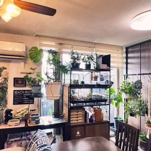 リビング① リビング奥の植物たち🪴 右側の窓だけなので日当たり悪いです😅棚にLEDライト必須🔦 置くとこないでしょ?💦これ以上はダイニングテーブルの上しか……(ヾノ=ω=)ムリムリ