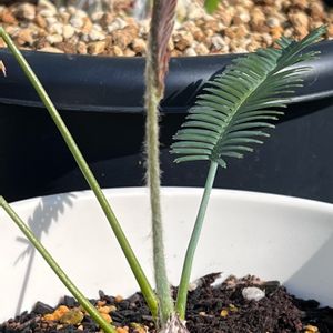 お迎えして4年目のディオーン・エデュレ 初めて植え替えしました。根元を出してみたらソテツらしくなりました。 毎年1本しか葉っぱ出さないので今年で5本になるかな!