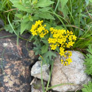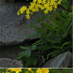コキンレイカ(小金鈴花) 別名ハクサンオミナエシ(白山女郎花) こんな崖の岩場に~😲と、思う所に咲いていました。金鈴の名前に相応しく、鮮やかな黄色の小花が集まって可愛い花です🔔❇️。厳しい環境の中でも咲いて、逞しい~💪。(上高地)