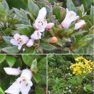 小さな小さなチョウジコメツツジ。 ほんのりと薄紅がかっています。 花筒が細長いことから丁子にたとえたもので4本の雄しべは花冠の外に飛び出さません。 亜高山帯~高山帯下部の風の強い岩礫地に生えるためか、花冠や葉は毛で被われています。 分布は中部地方と愛媛県となっています。 ↘️はコキンレイカとチョウジコメツツジが一緒に写ったもので、チョウジコメツツジの花は小さくて粉雪のように見えます。